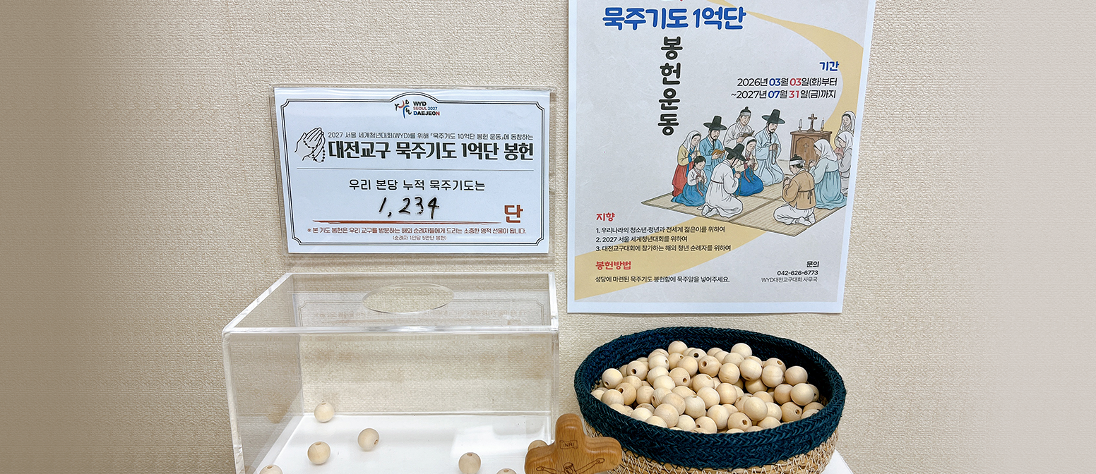 대전 교구는 한국 교회가 함께하는 「묵주기도 10억 단 봉헌 운동」에 동참함과 동시에, 대전교구를 방문하는 해외 순례자를 위해 「대전교구 묵주기도 1억 단 봉헌 운동」을 통해 성모님과 함께 2027 WYD 대전교구대회를 준비합니다.(1인당 묵주기도 5단을 봉헌, 2,000명 기준, 총 1억 단 봉헌)